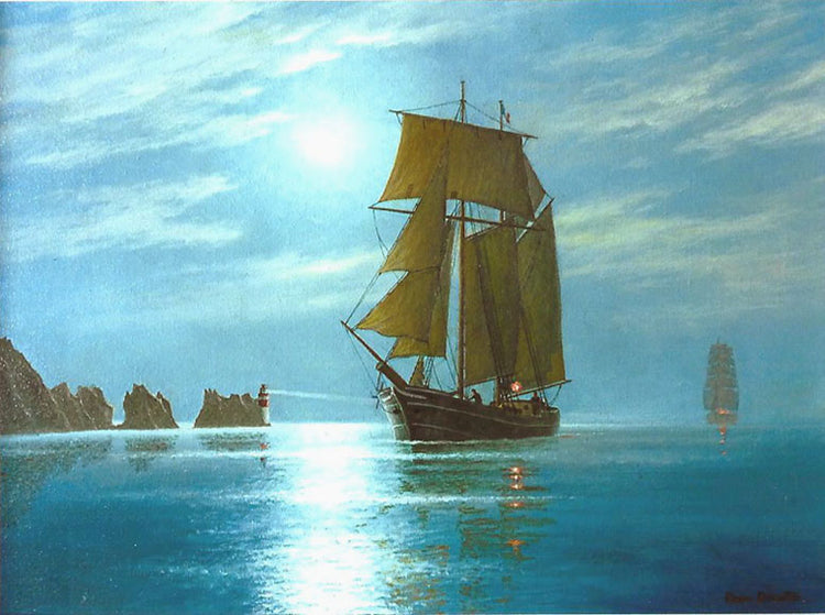 The discipline of marine painting calls for great accuracy of detail concerning ships and their rigging, and Desoutter painstakingly researches his subject before he paints it.