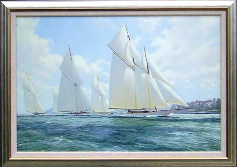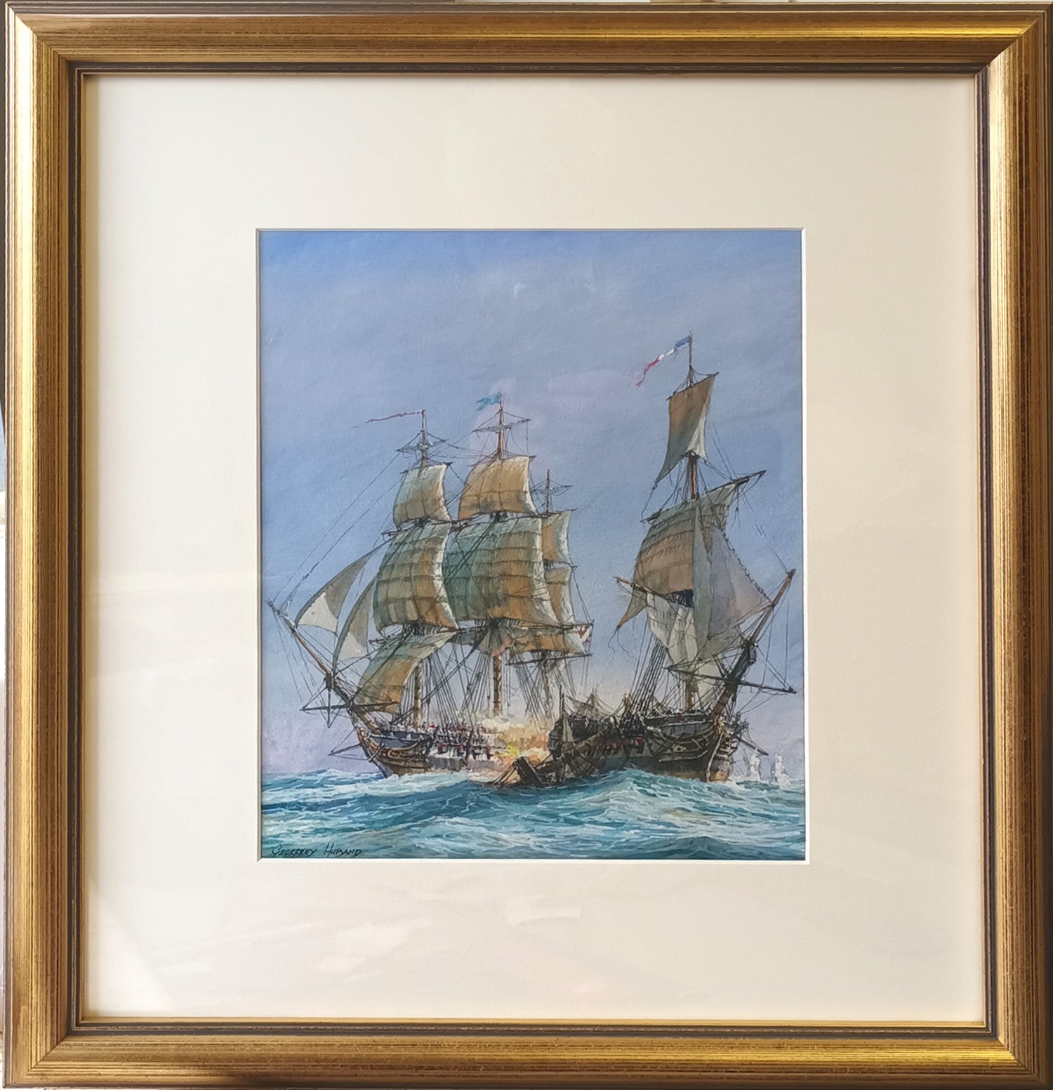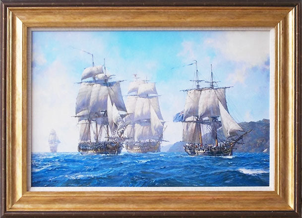The standard recommended frame style for historical marine art on paper is in a plain, rounded, 40mm gold with black toning. The print is mounted in an off-white acid-free bevel-cut window mount (matt). We use 2mm float glass or perspex, hangers and cord.
