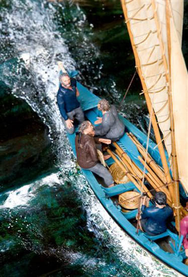 Plank on frame construction built in wood in the same method as the original full size item. Scale 1/35 the boat is about 9 inches long. Set in a sculpted porcelain sea and a golden oak case. The whaleboat is fully equipped with harpoons etc. Shown returning from a whale hunt under sail. These boats were sometimes dragged many miles from their ship when attatched to a whale and were often obliged to sail for several hours to get back to their ship.