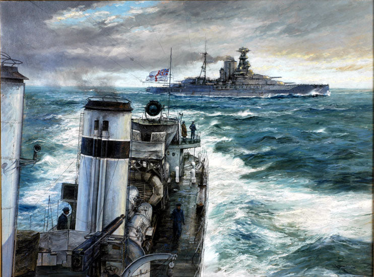 This painting shows H.M.S Barham under escort by HM.S Gallant in the Western Approaches before WW2.