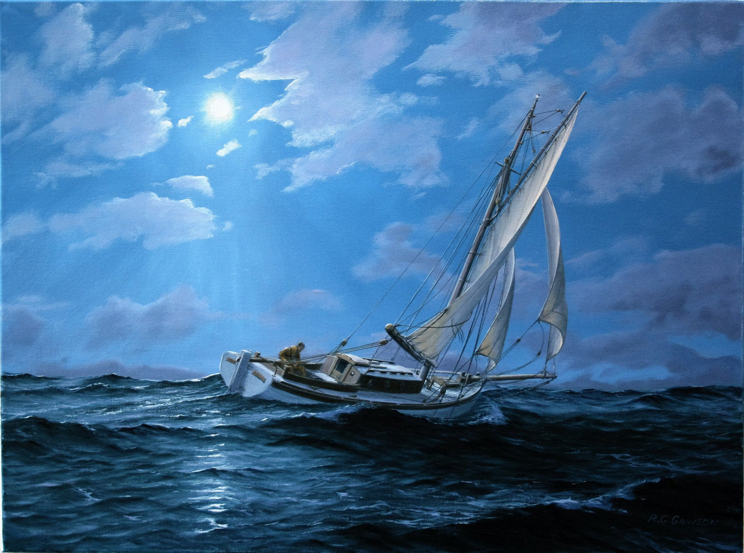 A night passage in a small sailing vessel can be anything from awful to magical. Here a 28ft gaff cutter based loosely on a boat the Artist once owned is enjoying the latter of the two, a full moon glittering on the water and a force 5 breeze just aft of the beam. A single reef in the mainsail would mean an easy helm and with staysail and jib pulling like horses the cutter is surging along at over 6 knots giving the lone helmsman a night passage to remember.