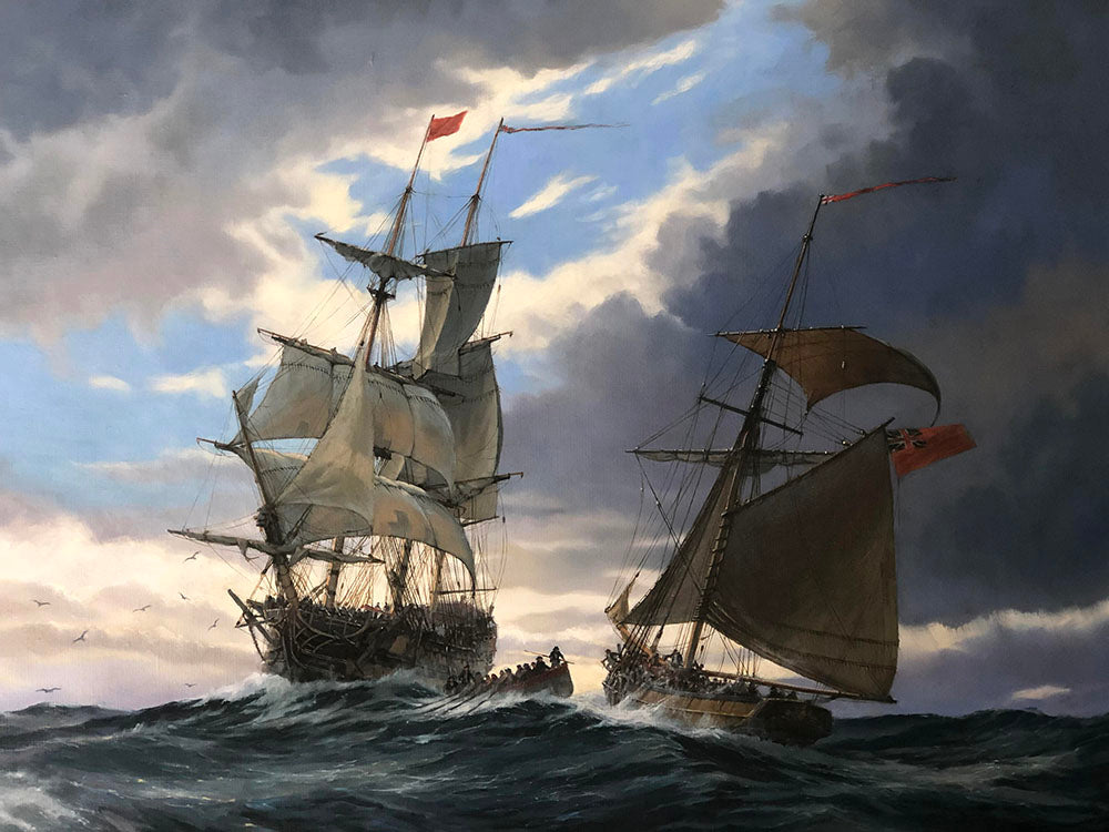 A 74-gun ship makes a rendezvous with a Naval cutter whilst on blockade duty, circa.1806