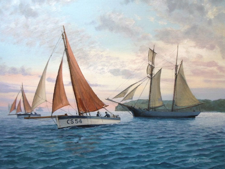 Astern of them a two mast tops'l schooner is also making use of the SW breeze to clear the harbour...