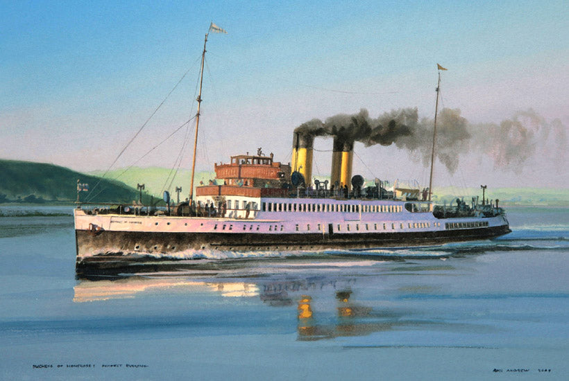 A turbine steamer built by Wm Denny & Bros Ltd, Dumbarto, launched 10th May 1930. In the days of Sunday restrictions on alcohol sales, trips “doon the water” on the Firth Of Clyde were a popular way to access a drink as travelers were exempt from the worst of those restrictions. Pre-war she cruised in the lower Firth to Arran, Ayr, and as far as Stranraer. She remained on the Clyde through WWI then went back to cruising as far as Inveraray. Withdrawn after the 1964 season, finally leaving the Clyde in September 1965 to be scrapped at Ghent.