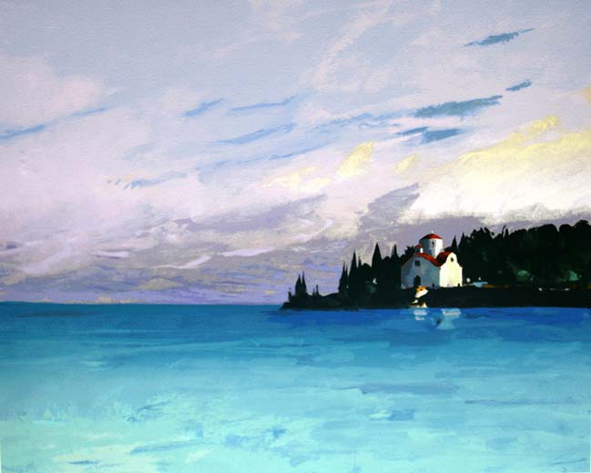 A small church on an island is dwarfed by the scale of sea and sky. The sea is calm and the sky full of gentle rolling clouds, creating a meditative atmosphere.