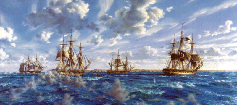 The Resistance on the right has just 'struck' and let run her topsail halyards and her ensign in surrender. La Nymphe (Captain John Cooke), in the left foreground having put a party off to take possession, has let fly her jib sheets and backed her mizen topsail to present her broadside which she is discharging into the little Constance on the extreme left of the picture. San Fiorenzo (Captain Sir Harry Neale), centre background, has backed her main topsail to reduce speed and has brailed her driver and backed her jib to come to starboard to deliver her broadside also into the Constance. In a moment both frigates will let draw to pace the Constance in a running point-blank bombardment.