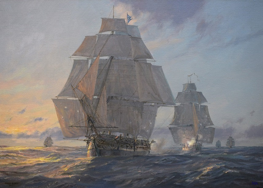 Most importantly on this day, Endymion had the speed to catch the American...Endymion surged on ahead and after a chase of seven hours gradually began to overhaul President despite every resource Decatur employed to escape. The two ships were firing steadily at each other from 2 pm onwards. The winter sunset was at 4.45 pm; still they fought on at close range. Around 8 pm aboard Endymion it seemed that President had ceased fire and they even believed that Decatur had surrendered; but the American dismantling shot had wrecked Endymion's sails and she had no boats left to take the surrender, so she stood off to bend six new sails...before resuming the chase. By now the rest of the British squadron had caught up, and at 11.40 pm it was HMS Tenedos that finally took the American flagship's surrender." - Geoff Hunt PPRSMA
