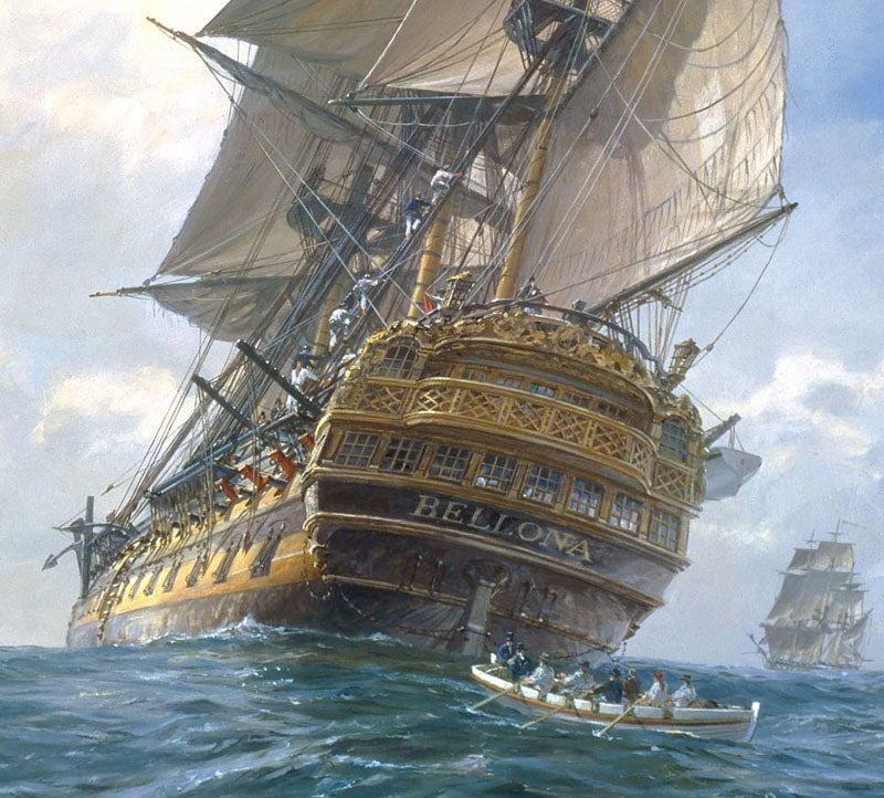 Jack Aubrey is in command of Bellona (74 guns) as part of the inshore squadron blockading the port of Brest. A cutter leaves the ship as an officer looks on from deck and sailors go aloft.
