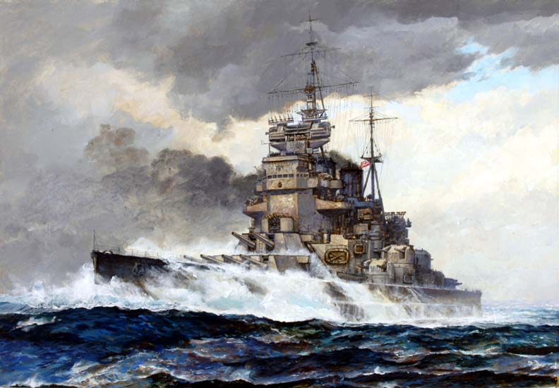 First, of the new breed of British battleships built before WW2, KGV had an unusual main armament of 14" guns in double and quadruple turrets. These were troublesome mountings initially, frequently breaking down when going into action. However, when the bugs were ironed out KGV and her sisters proved very strong and useful ships.