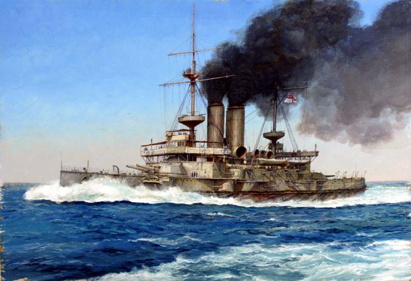 A close cousin of H.M.S. London, she began WW1 on the quiet South American station. However, she joined Sir Christopher Craddock's cruiser squadron (Good Hope, Monmouth, Glasgow) in search of Graf von Spee's Cruisers. At 18 knots, Canopus was soon left behind by Craddock's other ships and was unable to help her unfortunate Admiral when he went to his death at the battle of Coronel.