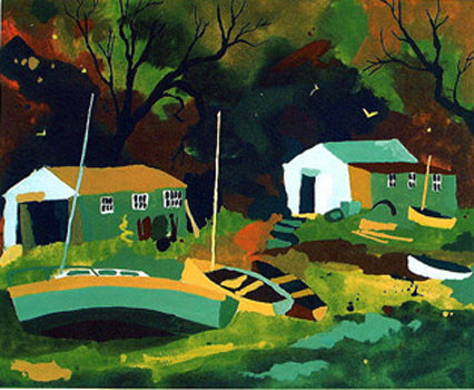 25 Colours. Silkscreen of a Cornish boat scene. The image shows two boat houses and a number of small fishing boats around them. Colours are white blue green yellow brown and black.
