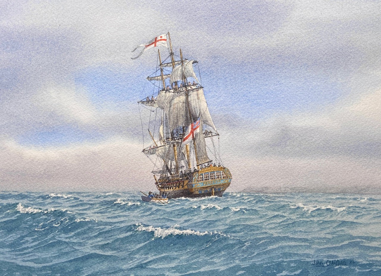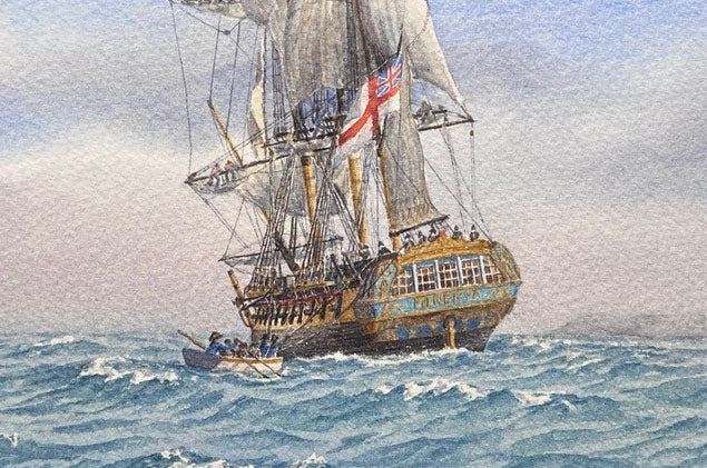 Shortly after, while dining at the Commodore’s table, came the call “Man overboard!” few sailors could swim, but the codes that governed life at sea meant an attempt to rescue was required. The officers ran on deck, within seconds, Lieutenant Hardy with a party of sailors were lowering the jolly-boat. The strong currents in the straits had carried it astern of the frigate towards the Spanish ships. Hardy signalled the man-overboard was lost and was now in a perilous situation. The Jolly-boat rowers pulled hard but could not regain the frigate. At this crisis Nelson exclaimed “My God, I’ll not lose Hardy!”. "Back the mizzen mainsail" was his first command, no sooner done than the Minerva's progress was retarded and this allowed the current to carry her down to Hardy on the jolly-boat. The pursuing Spanish ships misread the situation and thought Nelson was in touch with the fleet and dropping back to draw them into a trap – they shortened sail and slowed to a distance. Nelson picked up Hardy and the jolly-boat, put out more sail and lost the pursuers.