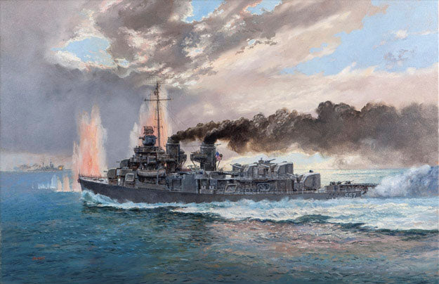 "This painting shows the heroic ship and her captain Ernest Evans charging toward the Japanese cruiser whilst laying a smokescreen. When she was finally sunk and her captain lost, the Japanese sent a destroyer to comb the wreckage and the survivors saw the Japanese captain, in full dress uniform saluting them. This was unique in the Pacific War and a recognition of the bravery of Captain Evans and the crew of USS Johnston, by their enemy.